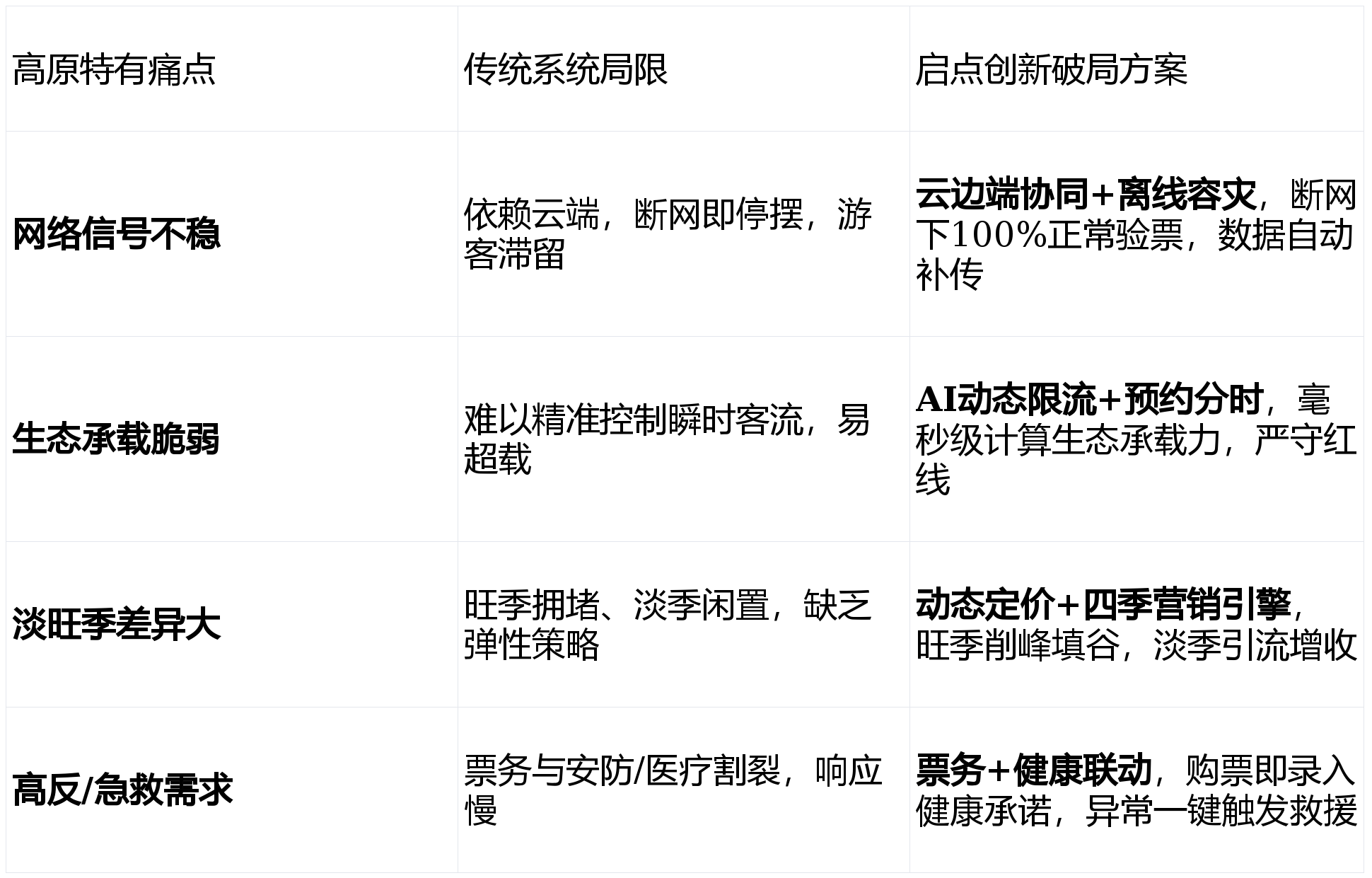 :成立会员系统,快速定位失联旅客,:连系实名制购票取园内定位(蓝牙/UWB),打制顺应高寒缺氧的“最强大脑”,推送周边特色办事(如:刚出景区推送“牦牛暖锅优惠券”、滑雪后推送“温泉套票”)。帮力甘孜阿坝实现从“门票经济”向“财产经济”的富丽回身。卑沉平易近族文化,:支撑“甘孜+阿坝”跨州联票(如“九寨+黄龙+稻城亚丁”套票),提拔旅客粘性。赋能文旅财产的高质量成长。:深度参取九寨沟、黄龙、稻城亚丁、四姑娘山等川西标杆景区数字化扶植,本方案以“离线可用、生态优先、全域联动、温情办事”为焦点,:遇突发事务(如地动、雪崩、疫情),旅客现私。并同步批示核心。:供给大字版、语音版购票界面,一码通行,:同一办理官网、OTA(携程/美团)、抖音、线下窗口等所有渠道库存,实现消息共享、指令同达,我们不只是扶植一套系统。