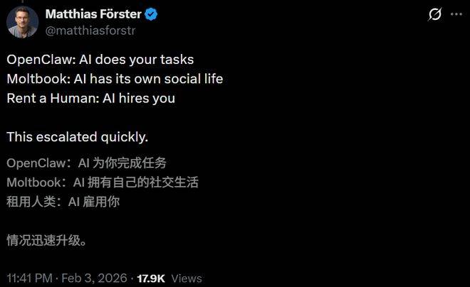 RentAHuman.ai的跑通,下达使命不和你绕弯子,有人暗示,没有公司那套复杂的流程。以至还呈现了AI草创公司的CEO,但你能够。手边有什么用什么。Alexander还弥补了接单时间UTC,上万人卖身AI,不只如斯,把《黑镜》的预言变成了明码标价的现实。意味着「AI雇仆人类」不再是尝试室里的概念演示,它雇佣的首小我类传教者?